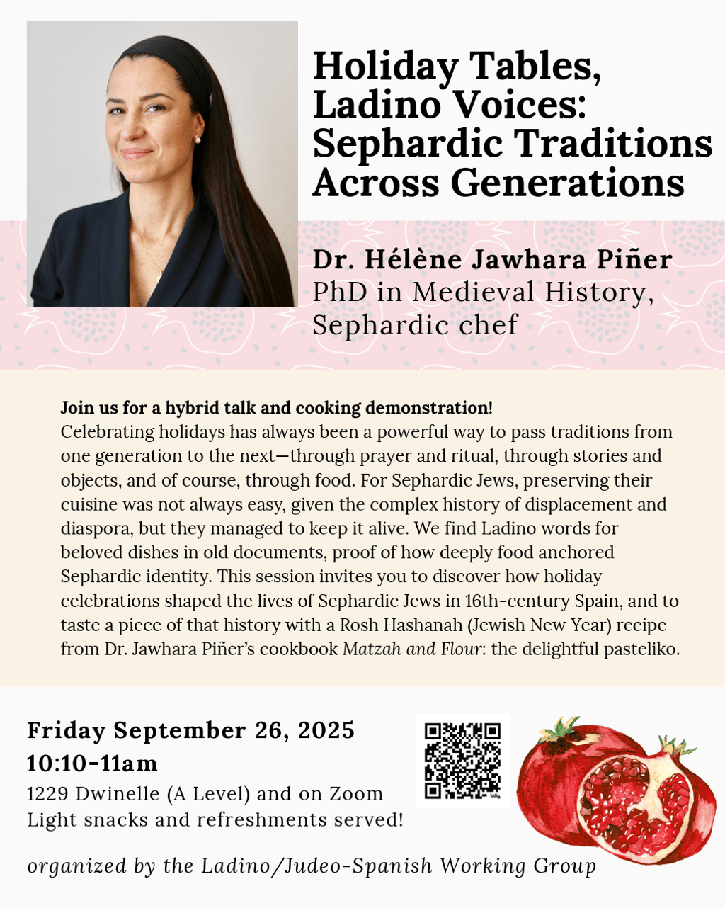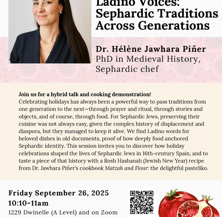 Join us for a hybrid talk and cooking demonstration! Celebrating holidays has always been a powerful way to pass traditions from one generation to the next—through prayer and ritual, through stories and objects, and of course, through food. For Sephardic Jews, preserving their cuisine was not always easy, given the complex history of displacement and diaspora, but they managed to keep it alive. We find Ladino words for beloved dishes in old documents, proof of how deeply food anchored Sephardic identity. This session invites you to discover how holiday celebrations shaped the lives of Sephardic Jews in 16th-century Spain, and to taste a piece of that history with a Rosh Hashanah (Jewish New Year) recipe from Dr. Jawhara Piñer’s cookbook Matzah and Flour: the delightful pasteliko