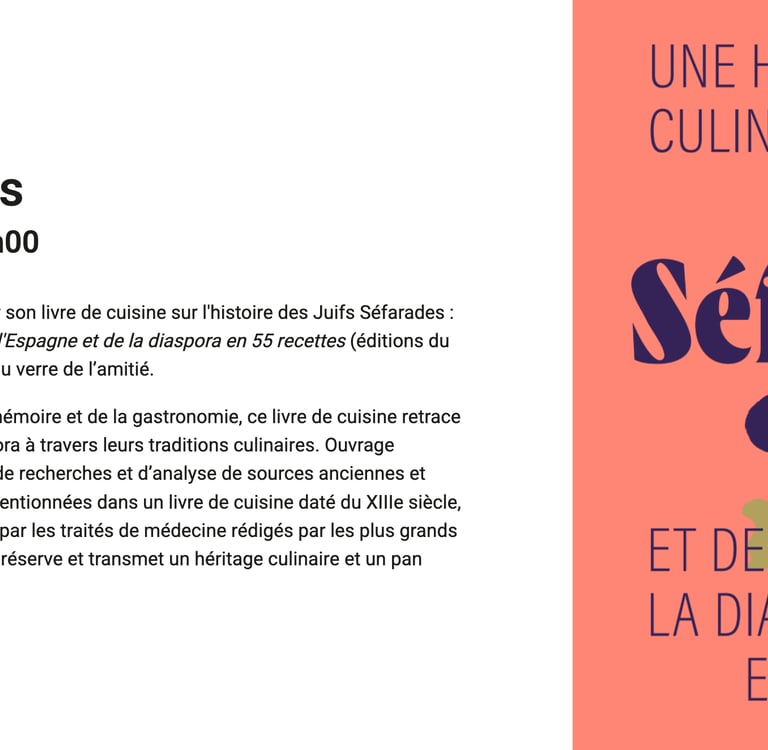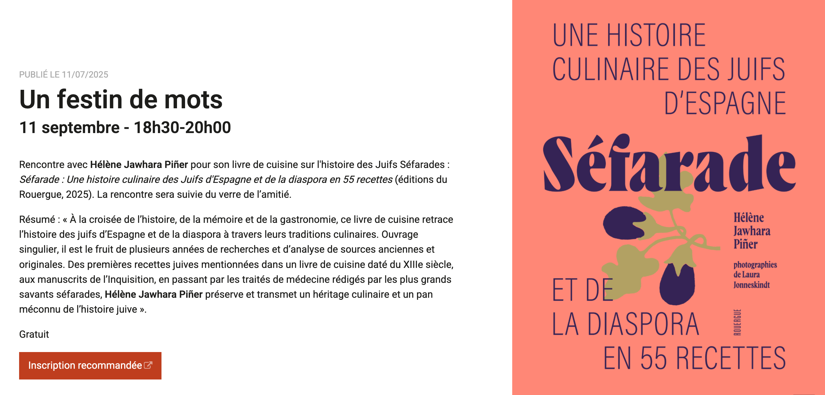 Rencontre avec Hélène Jawhara Piñer pour son livre de cuisine sur l'histoire des Juifs Séfarades : Séfarade : Une histoire culinaire des Juifs d'Espagne et de la diaspora en 55 recettes (éditions du Rouergue, 2025). La rencontre sera suivie du verre de l’amitié.